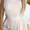 Elegancka plisowana sukienka – sukienka z kremowego materiału z plisowanym dołem. Sukienka z zabudowanym przodem, okrągły dekolt. Talia podkreślona wiązanym paskiem. Sukienka krótka idealna na wieczorne wyjścia, do biura, czy też na co dzień.