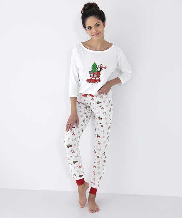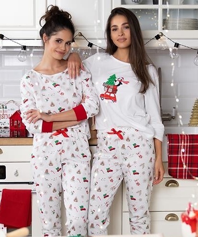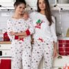 Świąteczna Piżama damska z długimi spodniami, i długim rękawem – 3/4 długości. Koszulka od piżamy ma okrągły, głęboki dekolt. Spodnie od piżamy są długie, z ozdobną czerwoną satynową kokardką, a zakończone wygodnym ściągaczem. Świąteczna piżama damska Sensis uszyta jest z naturalnej, wysokiej jakości 100% bawełny.