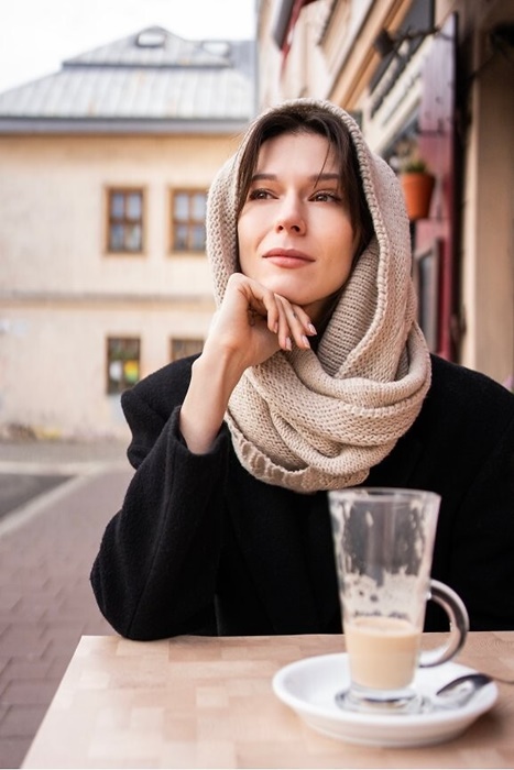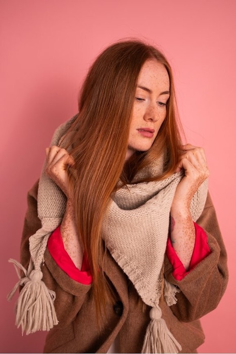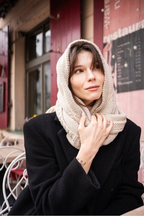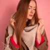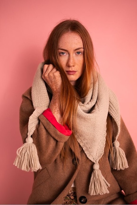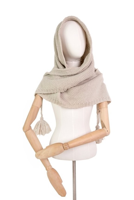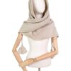 Ciepły szal damski, narzutka na ramiona. Ciepła chusta na ramiona, pleciona, bezowa – idealna do opatulenia. Szeroki i długi (180cm) szal w kształcie trójkąta. Szal damski akrylowy.