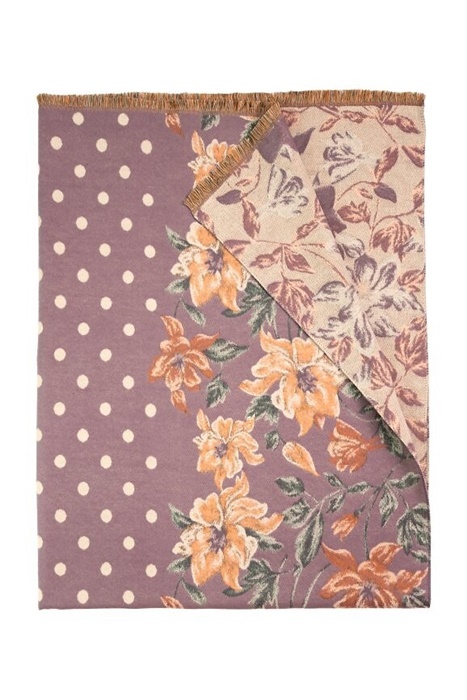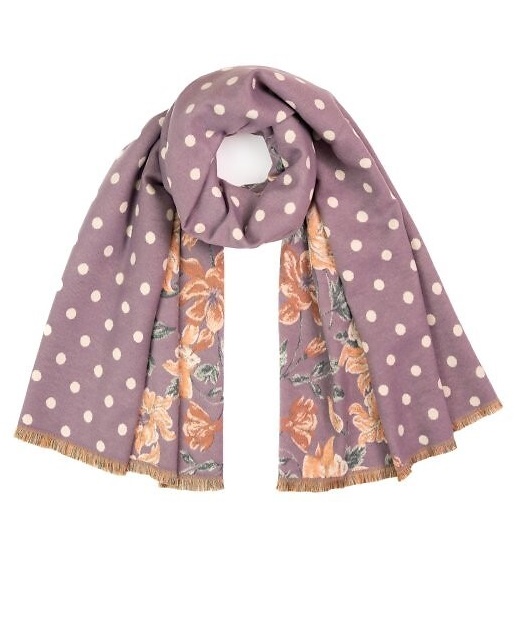 Szal damski długi w groszki i kwiatki w kolorze lawendowym.