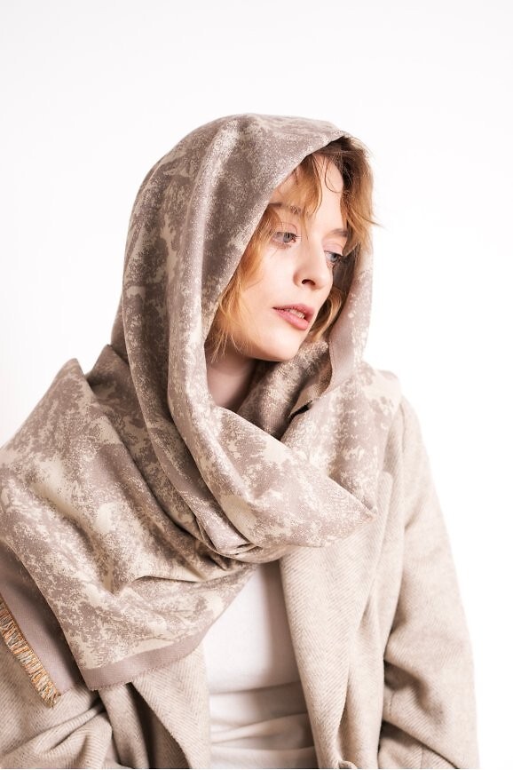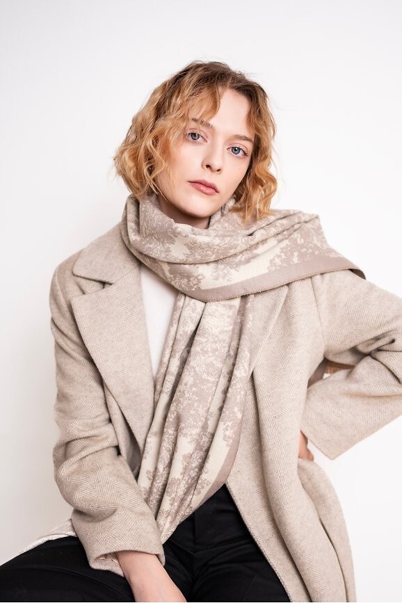 Elegancki szal damski długi w botaniczny wzór w kolorze ecru granat.