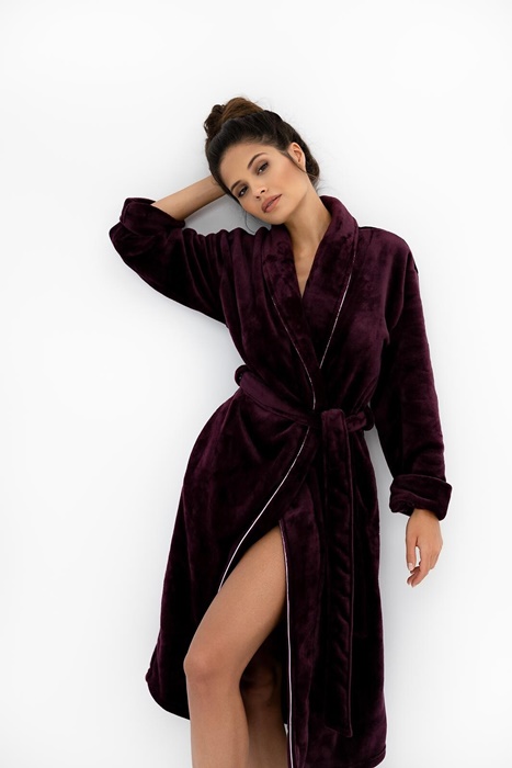Ciepły i długi Szlafrok damski długości do łydki z miękkiej i puszystej dzianiny. Puszysty i gruby szlafrok – w sam raz na chłodniejsze wieczory, noce i poranki. Szlafrok damski z kołnierzem szalowym. Elegancki fason miękkiego i ciepłego szlafroka damskiego bez kaptura. Szlafrok damski bordowy z eleganckimi lamówkami. Wiązany w pasie.
