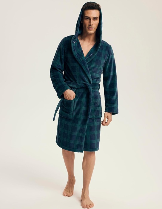 Szlafrok męski z długim rękawem, długości do kolan. Szlafrok ciepły i miękki, wiązany paskiem. Szlafrok męski w zielono granatową kratkę. Po bokach ma kieszenie. Szlafrok męski ciepły z kapturem.