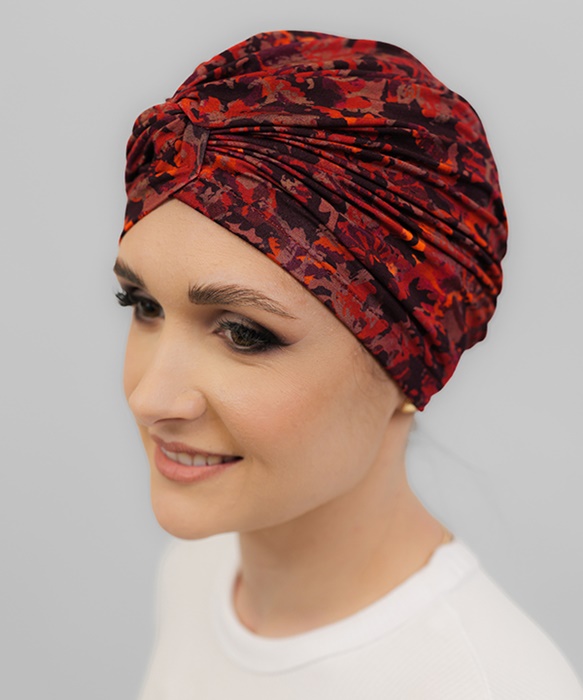 Turban Klara – to dość prosty ale efektowny model uszyty z delikatnej tkaniny bambusowej z ozdobnym marszczeniem a’la supeł, z przodu turbanu. Turban jest gotowy do nałożenia. Tkanina bambusowa jest niezwykle miękka i delikatna, turbany są gładkie i miłe w dotyku. Turban jest cienki (idealny na upały i po chemii) – bez dodatkowych ozdobnych szarf / oplotów – idealny dla wielbicielek minimalizmu.