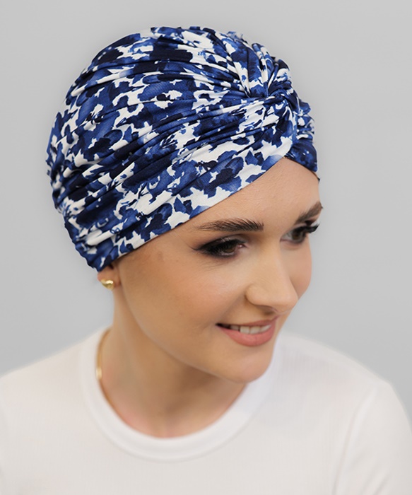 Turban Klara – to dość prosty ale efektowny model uszyty z delikatnej tkaniny bambusowej z ozdobnym marszczeniem a’la supeł, z przodu turbanu. Turban jest gotowy do nałożenia. Tkanina bambusowa jest niezwykle miękka i delikatna, turbany są gładkie i miłe w dotyku. Turban jest cienki (idealny na upały i po chemii) – bez dodatkowych ozdobnych szarf / oplotów – idealny dla wielbicielek minimalizmu.
