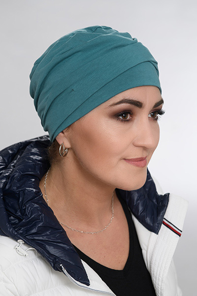 Wygodny damski turban na głowę Laila to prosty model turbanu na głowę uszyty z delikatnej tkaniny bawełnianej (bawełna premium) z ozdobnym marszczeniem / zakładką z przodu turbanu. Turban jest gotowy do nałożenia, nic nie trzeba zaplatać;) Tkanina bawełniana jest niezwykle miękka i delikatna, turbany są gładkie, wygodne i miłe w dotyku. Turban jest średniej grubości – bez dodatkowych ozdobnych szarf / oplotów – idealny dla wielbicielek minimalizmu.