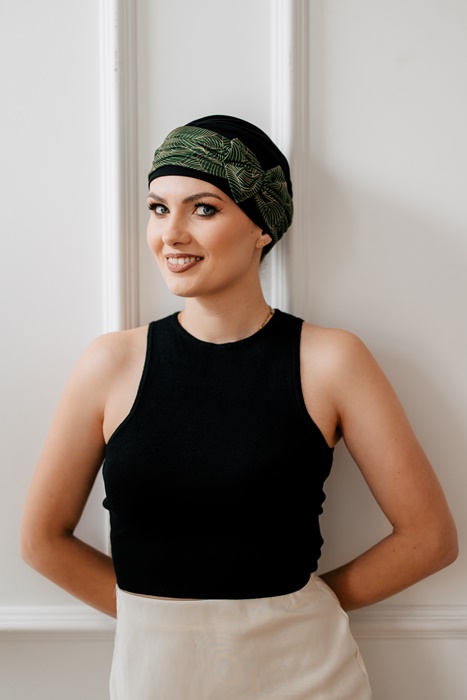 Turban Lenka – to model uszyty z delikatnej tkaniny bambusowej. U góry ma marszczenia oraz opasa go przyszyta (na stałe) szarfa ze zdobną kokardą. Kokarda jest z boku turbanu. Turban jest gotowy do nałożenia, nic nie trzeba wiązać i zaplatać;) Tkanina bambusowa jest niezwykle miękka i delikatna, turbany są gładkie i miłe w dotyku. Fason Lenka to idealny turban codzienny oraz eleganckie nakrycie głowy na wyjścia.