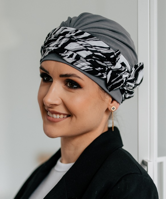 Turban Lenka – to model uszyty z delikatnej tkaniny bambusowej. U góry ma marszczenia oraz opasa go przyszyta (na stałe) szarfa ze zdobną kokardą. Kokarda jest z boku turbanu. Turban jest gotowy do nałożenia, nic nie trzeba wiązać i zaplatać;) Tkanina bambusowa jest niezwykle miękka i delikatna, turbany są gładkie i miłe w dotyku. Fason Lenka to idealny turban codzienny oraz eleganckie nakrycie głowy na wyjścia.