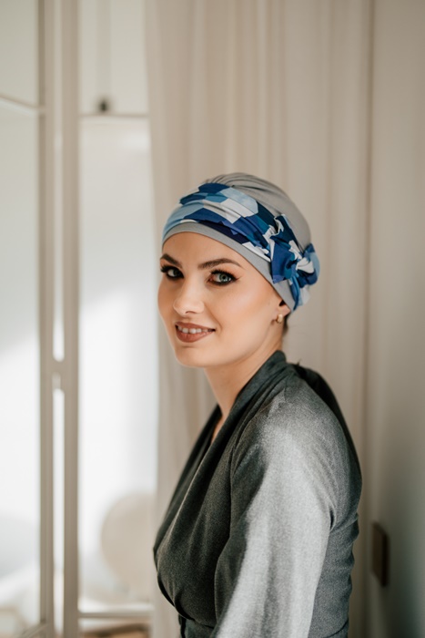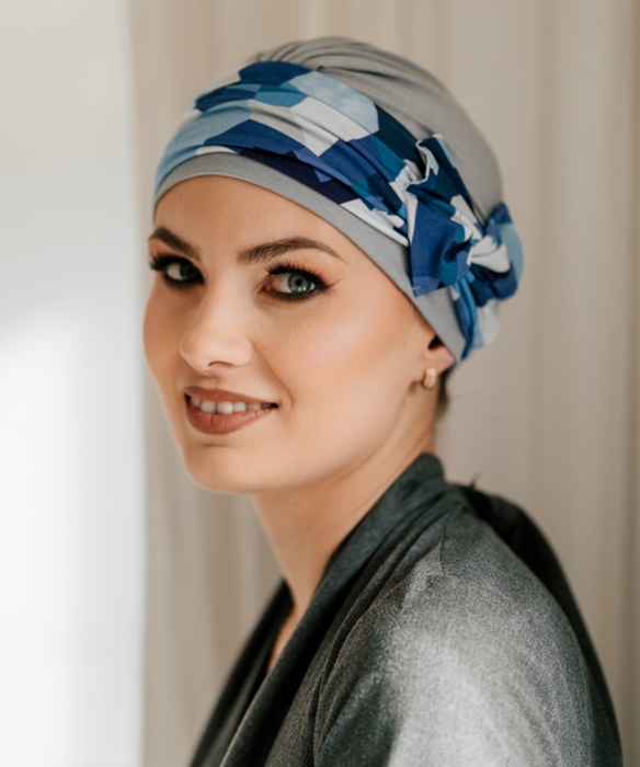Turban Lenka – to model uszyty z delikatnej tkaniny bambusowej. U góry ma marszczenia oraz opasa go przyszyta (na stałe) szarfa ze zdobną kokardą. Kokarda jest z boku turbanu. Turban jest gotowy do nałożenia, nic nie trzeba wiązać i zaplatać;) Tkanina bambusowa jest niezwykle miękka i delikatna, turbany są gładkie i miłe w dotyku. Fason Lenka to idealny turban codzienny oraz eleganckie nakrycie głowy na wyjścia.