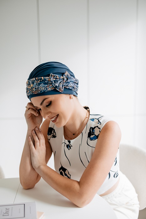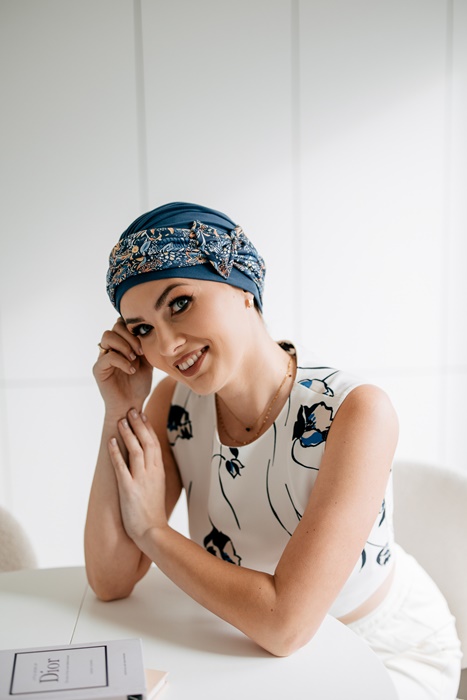 Turban Lenka – to model uszyty z delikatnej tkaniny bambusowej. U góry ma marszczenia oraz opasa go przyszyta (na stałe) szarfa ze zdobną kokardą. Kokarda jest z boku turbanu. Turban jest gotowy do nałożenia, nic nie trzeba wiązać i zaplatać;) Tkanina bambusowa jest niezwykle miękka i delikatna, turbany są gładkie i miłe w dotyku. Fason Lenka to idealny turban codzienny oraz eleganckie nakrycie głowy na wyjścia.