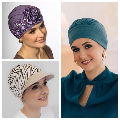 Na zdjęciu obok znajdziesz kilka modeli turbanów i chust z kolekcji letniej. Na lato wybrałam lekkie, cieńsze modele turbanów oraz chusty na głowę z daszkiem chroniącym przed słońcem – model Weronika.