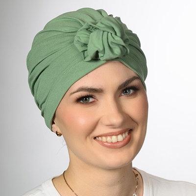 Turban Eryka – to model uszyty z delikatnej tkaniny bawełnianej. Turban jest delikatnie marszczony, z boku przyszyty jest ozdobny “kwiatek”. Tkanina jest miękka i delikatna, turbany są miłe w dotyku.